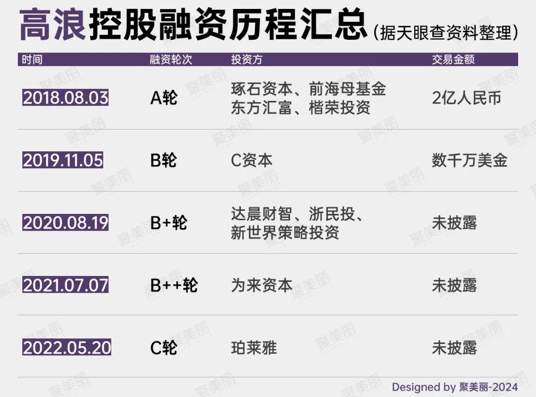 从融资历程来看,截至发稿前,高浪控股已完成了5轮融资,其中2018年8月的A轮融资,便获得了来自琢石资本、前海母基金等的2亿人民币投资,据报道称,是当时国内美妆行业融资最高纪录。不仅如此,高浪控股还两次获得香港新世界集团旗下基金的投资(C资本、新世界策略投资)。