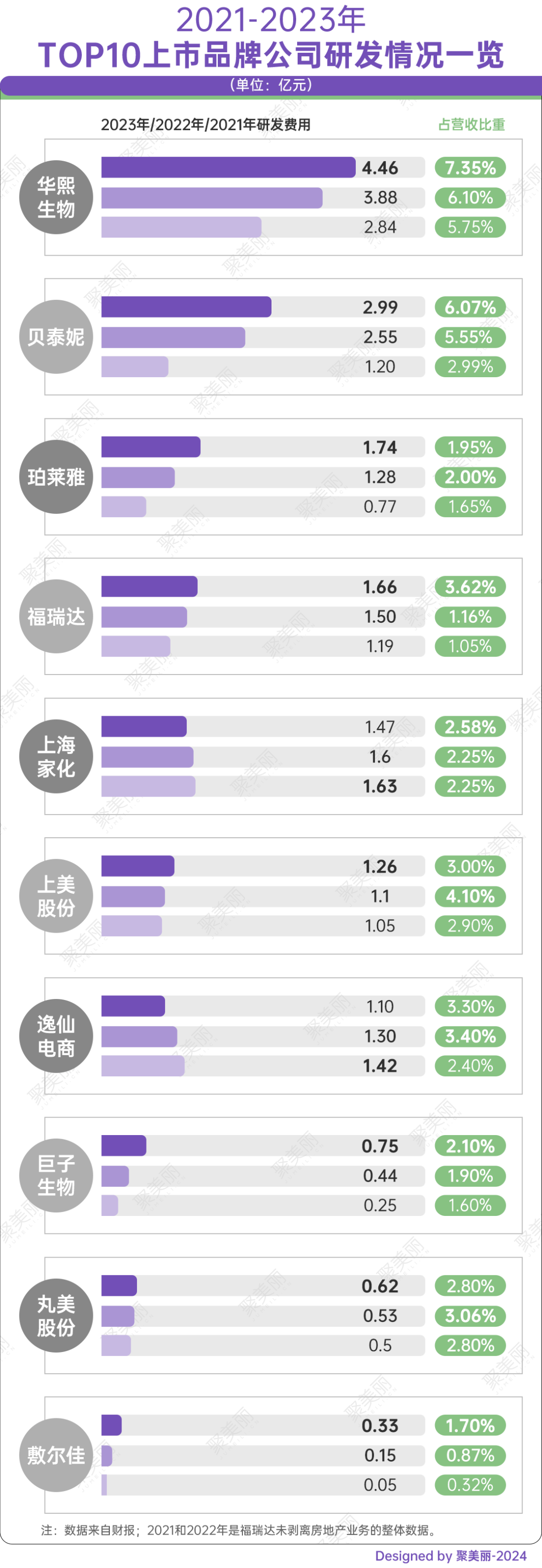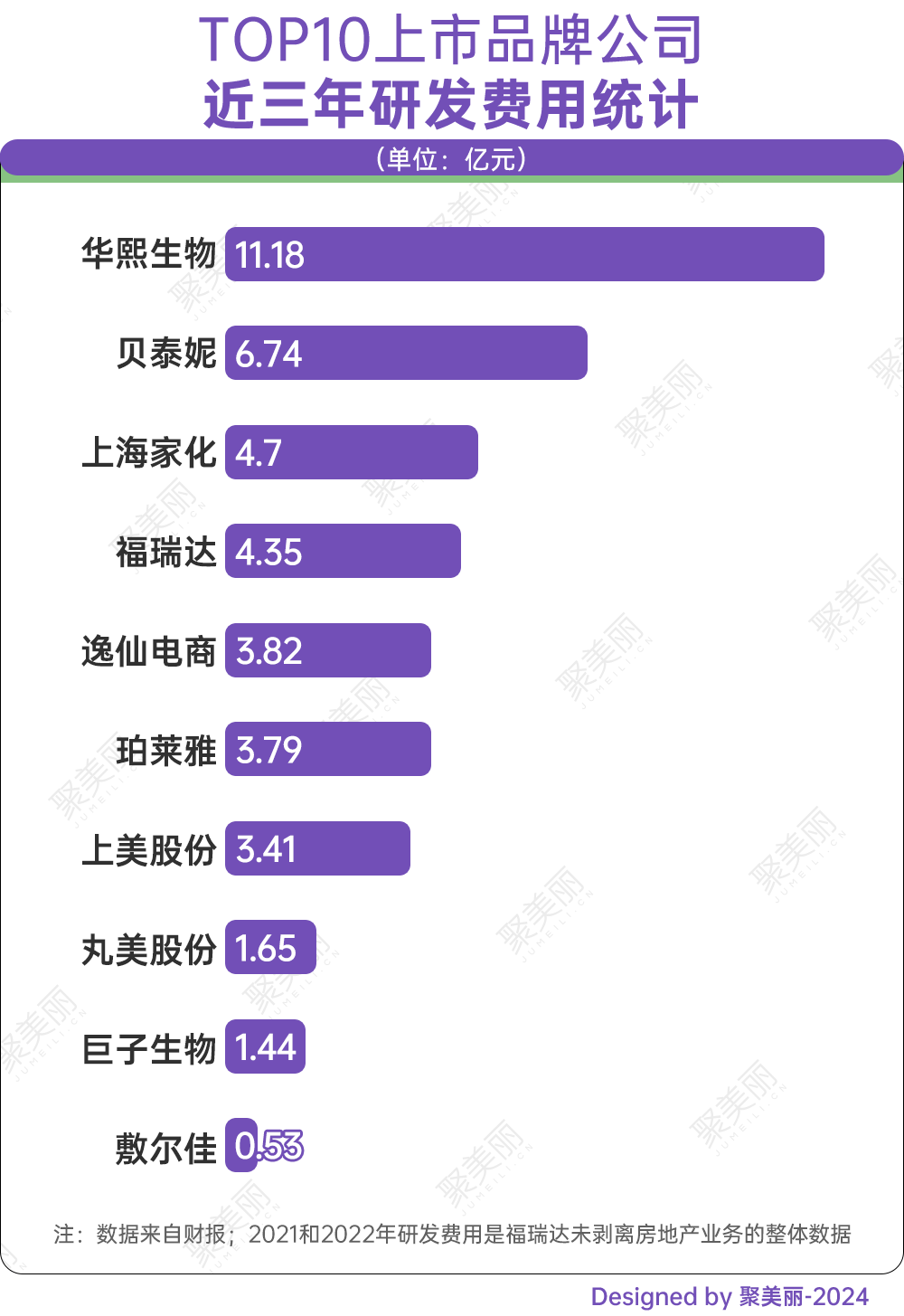 累计来看,近三年华熙生物的研发投入甚至已超10亿元,达11.18亿,贝泰妮投入超6亿元,上海家化和福瑞达紧随其后,逼近5亿元。而就在三年前,TOP10品牌公司的一年研发费用普遍在1亿元以下。