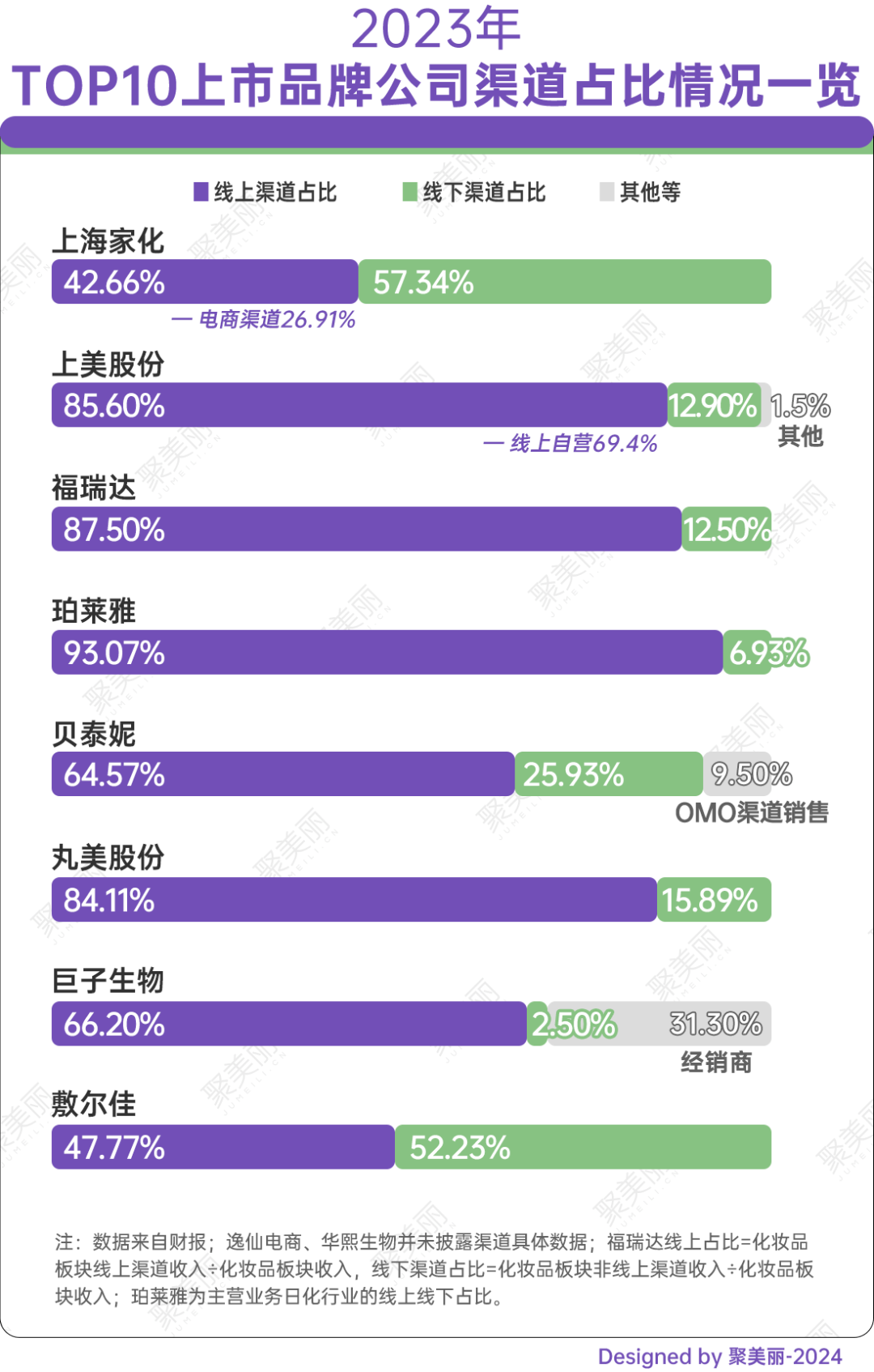 据聚美丽不完全统计,在2023年TOP10品牌企业中,除却上海家化和敷尔佳,其余企业的线上渠道占比都超过一半。其中,以线下渠道起家的珀莱雅占比最高,线上体量首次突破80亿,为82.74亿元,营收占比超九成。