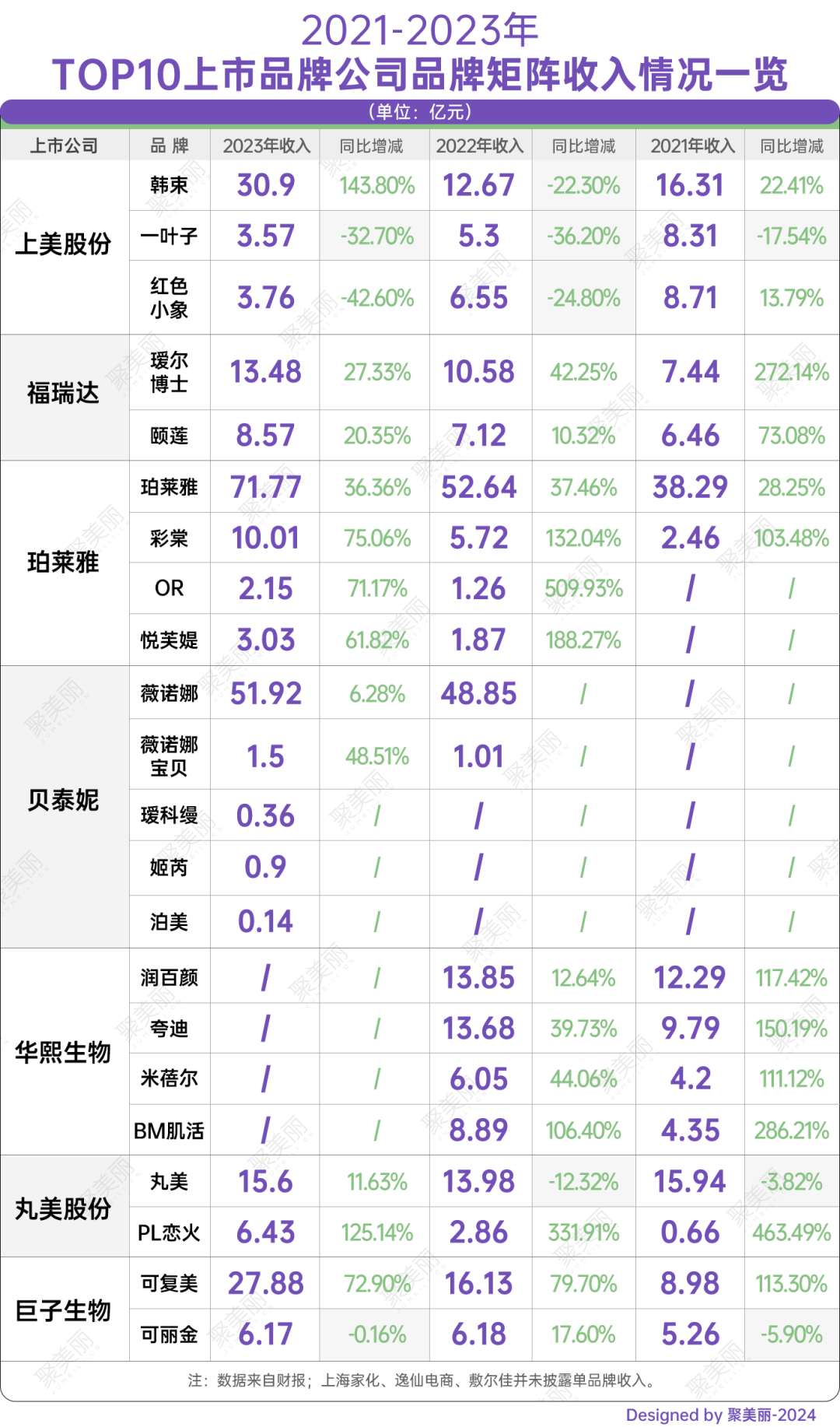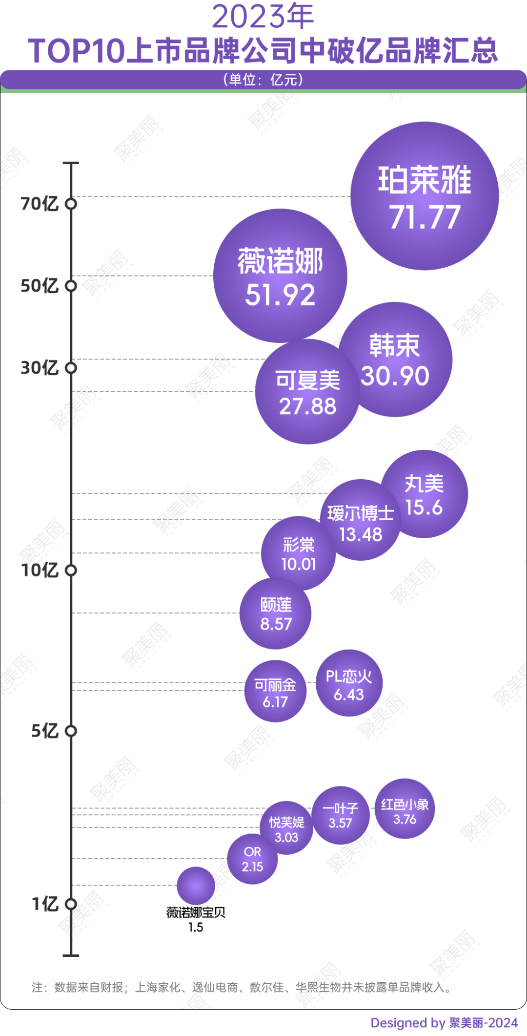 如,就此前的财报数据来看,2023年营收TOP10上市品牌公司中,珀莱雅其实是多品牌战略相对有进展的一个。在旗下4个品牌都保持增长的同时,彩棠还在2023年首次踏进十亿阵营。
