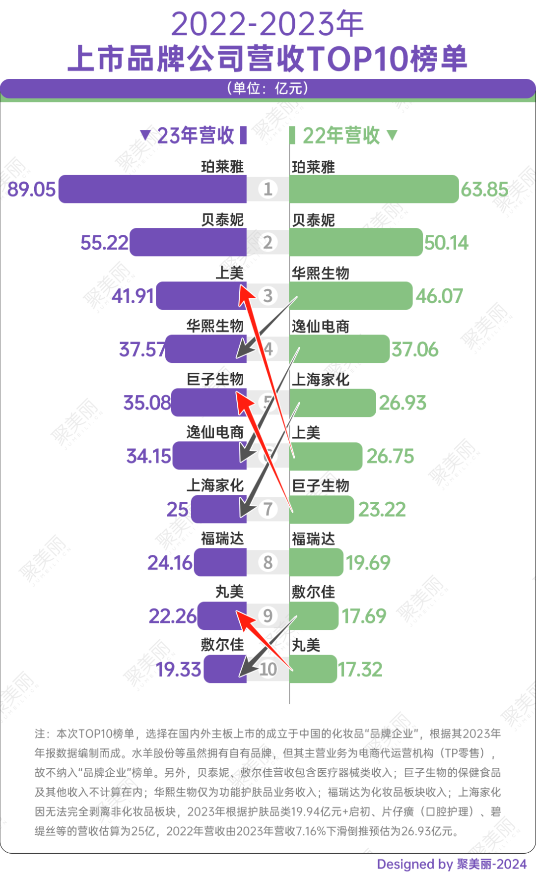 这一年,珀莱雅以89.05亿元的营收首次超越“老大哥”上海家化登顶TOP1,而后者已蝉联中国化妆品品牌上市企业营收TOP1二十三年。