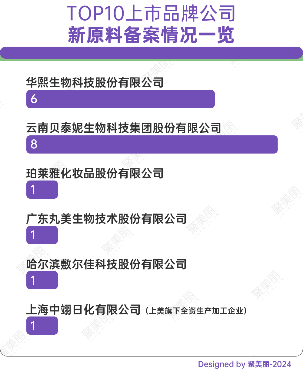 就原料创新上看,随着新原料备案“开闸”,华熙生物、贝泰妮、珀莱雅、丸美股份、敷尔佳、上美股份都在加大原料研发投入,并陆续有了成果。其中,以贝泰妮备案新原料最多,华熙生物次之,分别为8个、6个,其余企业都是1个。