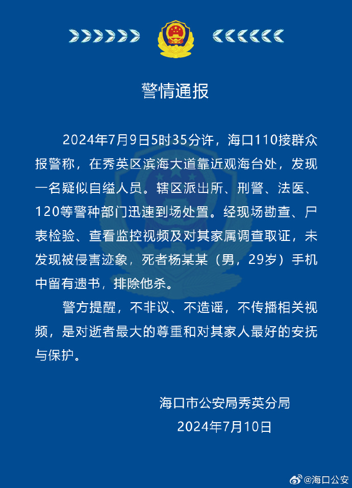 海南省海口市公安局官方微博7月10日通报,7月9日5时35分许,海口110接群众报警称,在秀英区滨海大道靠近观海台处,发现一名疑似自缢人员。辖区派出所、刑警、法医、120等警种部门迅速到场处置,经现场勘查、尸表检验、查看监控视频及对其家属调查取证,未发现被侵害迹象,死者杨某某(男,29岁)手机中留有遗书,排除他杀。