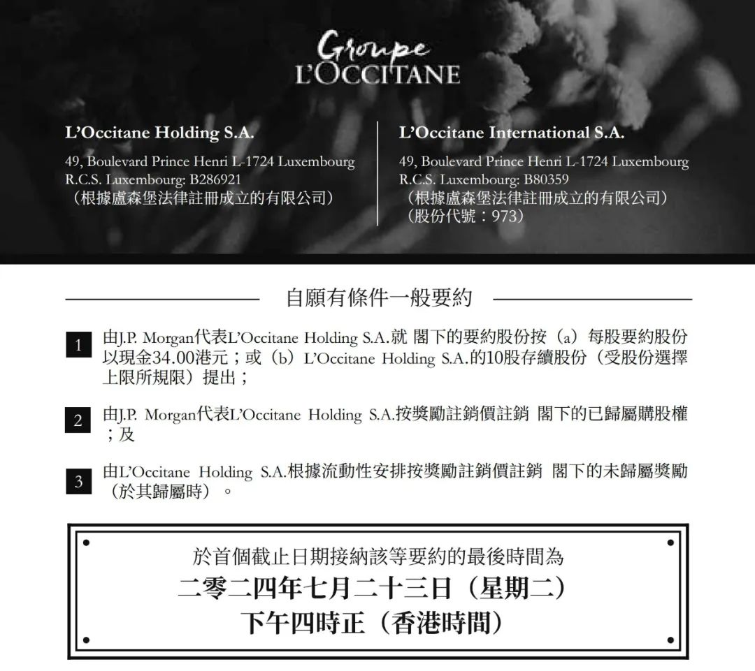 近日,欧舒丹发布公告称,集团控股股东提出以每股34港元收购其目前尚未持有的公司股份,欧舒丹的股东可以在今年7月2日-23日间接纳私有化要约。截至目前,此要约已获得超过47%的股东支持。