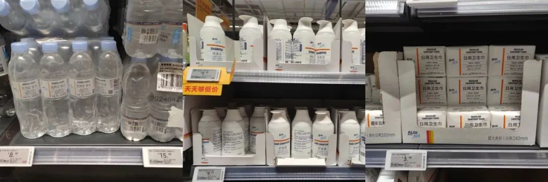 另一个值得注意的地方是,奥乐齐中国自有品牌产品占比超过90%。所谓自有品牌,就是直接和工厂合作生产出来的产品,比如奥乐齐旗下的矿泉水品牌“寻露”、牛奶品牌“悠白”,产品的包装上就标注了“ALDI奥乐齐专卖”。