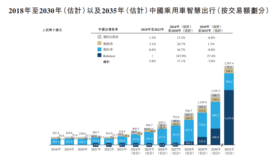 在如祺出行的规划中,公司的定位是一家“自动驾驶运营科技第一股”,它的业务除了网约车服务外,还有Robotaxi。Robotaxi是出行行业的未来发展方向之一,拥有更广阔的市场前景。中金数据显示,预计到2030年,Robotaxi全球市场规模超2万亿美元。