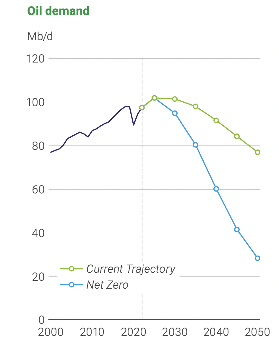 在当前轨迹中,石油消费量在展望后期将逐渐下降,到2050年降至7500万桶/日左右;在净零排放情景下,石油消费量的下降更为明显,到2050年,石油需求将降至2500-3000万桶/日,比2022年的水平降低约70%。