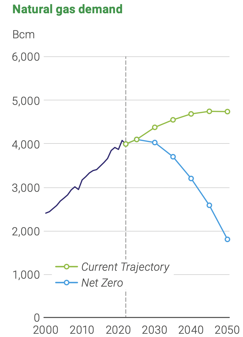 净零排放情景下,天然气需求在本世纪初达到峰值,到2050年约为2022年水平的一半。这主要得益于新兴经济体国家的经济增长和工业化,使其电力和工业部门的天然气消费量不断增加。