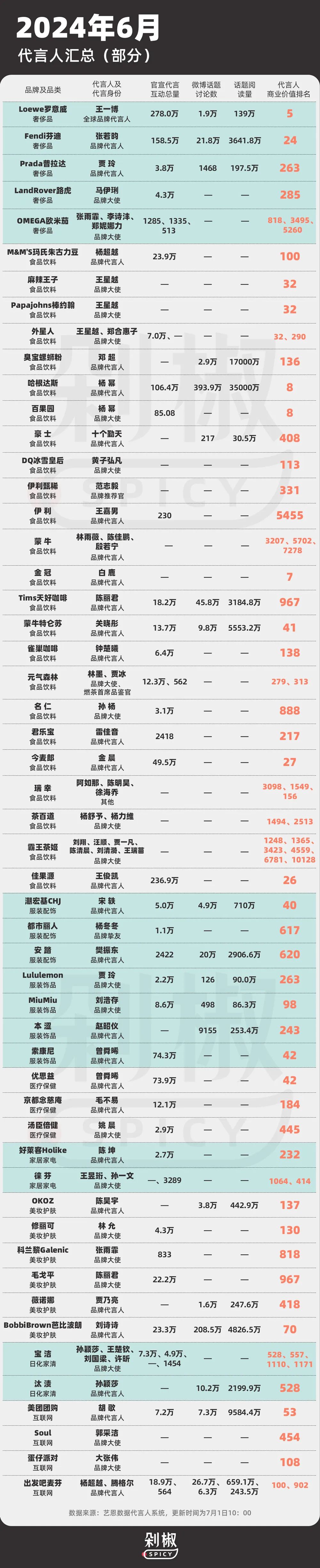 为此,剁椒Spicy开辟《代言人月度辣评》栏目,与艺恩等数据平台,以及兰渡、赞意等领先的营销机构联手,盘点代言动向,提炼行业观点。