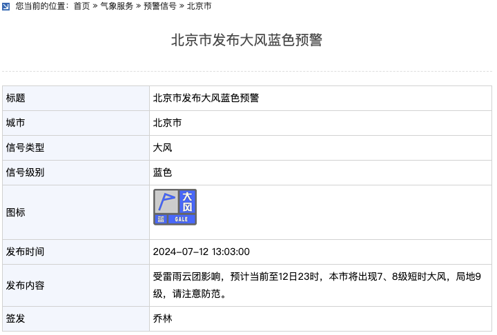 北京市发布大风蓝色预警:受雷雨云团影响,预计当前至12日23时,北京市将出现7、8级短时大风,局地9级,请注意防范。