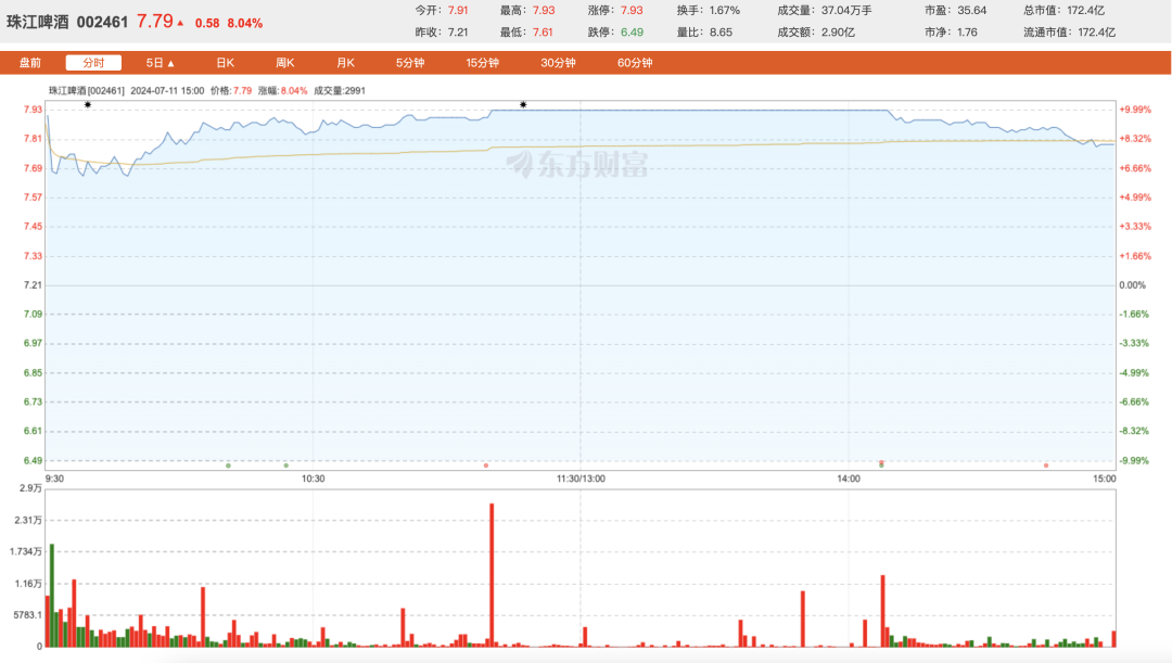 上半年的业绩增长给资本市场带来极大信心。7月11日,珠江啤酒涨停,股价为7.93元/股,市值176亿元。
