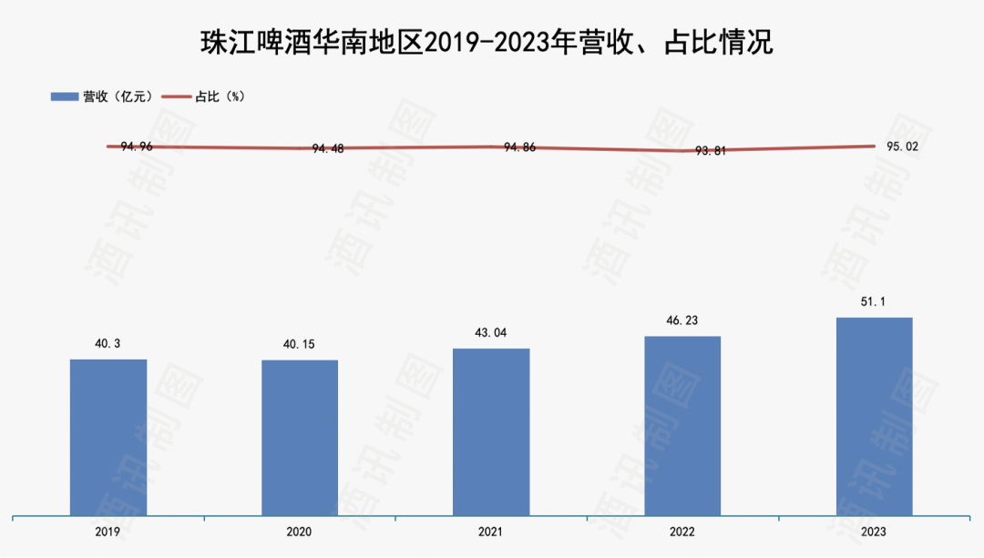 珠江啤酒财报显示,2023年,华南地区营收实现51.10亿元,占比95.02%。2019-2022年,珠江啤酒在华南地区营收分别为40.30亿元、40.15亿元、43.04亿元、46.23亿元,占营收比高达94.96%、94.48%、94.86%、93.81%。