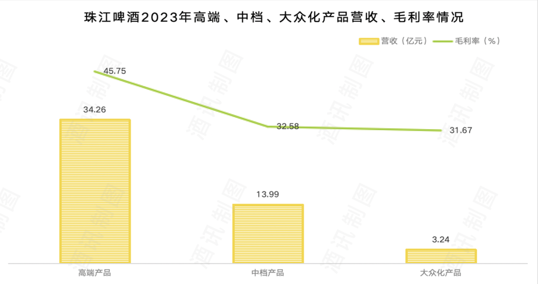 据了解,珠江啤酒按零售价格高低将啤酒产品主要分类为高端、中档及大众化产品。高端产品主要为纯生啤酒、雪堡啤酒,中档产品主要为零度啤酒,大众化产品主要为传统啤酒等。2023年,珠江啤酒的高端、中档及大众化产品依次实现营业收入约34.26亿元、13.99亿元、3.24亿元,毛利率约为45.75%、32.58%、31.67%。高档啤酒收入占当期营收总额的63.7%。