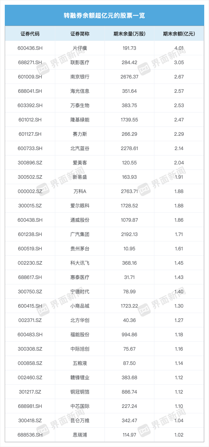 Wind数据显示,截至7月11日,2251只股票有转融券存续,28只股票转融券余额超过1亿元。其中,转融券余额位居前十的股票分别为片仔癀(4.01亿元)、联影医疗(3.05亿元)、南京银行(2.67亿元)、海光信息(2.57亿元)、万泰生物(2.53亿元)、隆基绿能(2.47亿元)、赛力斯(2.29亿元)、北汽蓝谷(2.14亿元)、爱美客(2.04亿元)、新易盛(1.91亿元)。