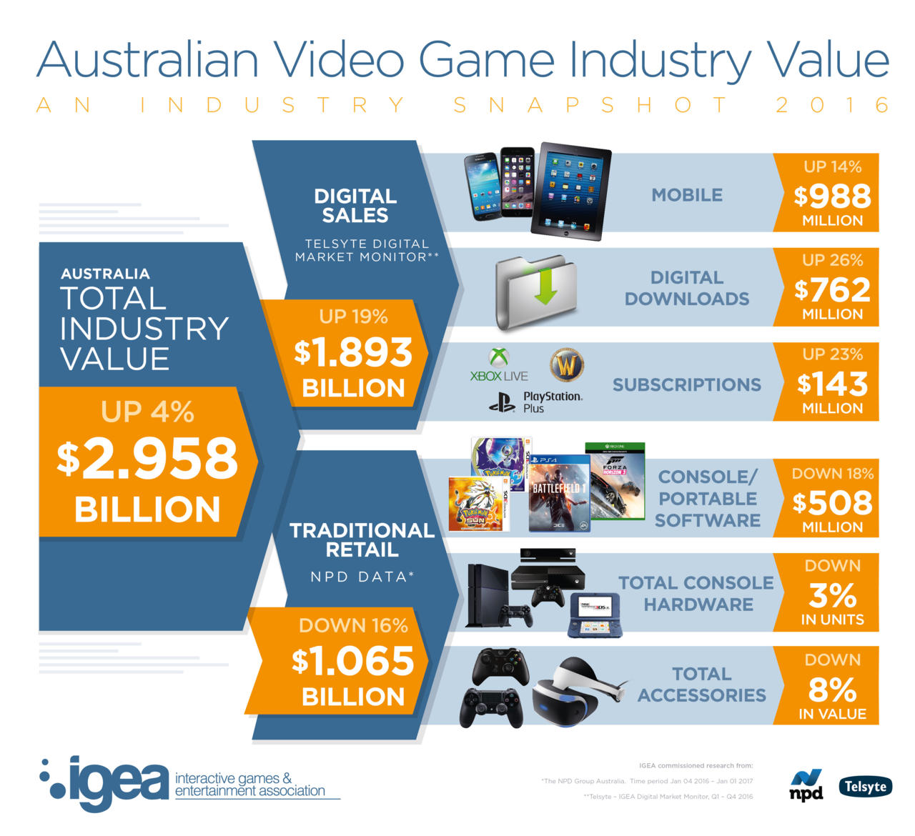 据互动游戏及娱乐委员会(IGEA)称,2016年,澳洲游戏产业创造了29.58亿澳元的收益,比2015年增长了4%。