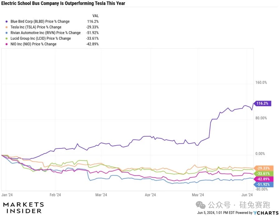 为了对比出Blue Bird有多么惊艳,这里不得不拉出最受欢迎的几支电动车股票来扎个心:2024年以来,特斯拉下跌29%,Lucid 下跌33%,Rivian下跌51%,蔚来下跌42%……(截止2024年6月)