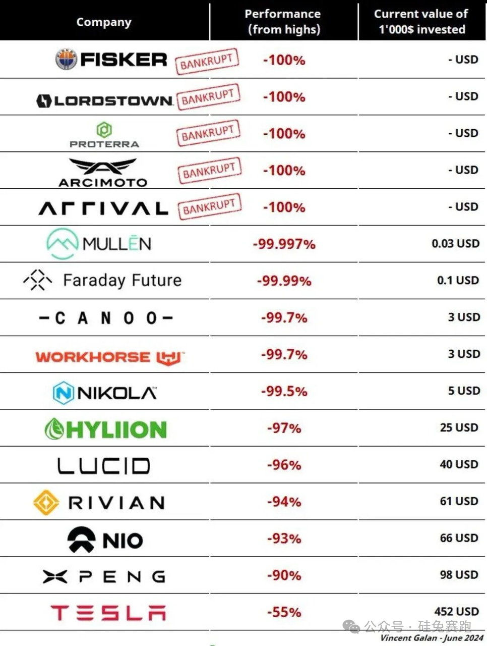 真令人惋惜,把新能源车的市值和历史最高位做个对比,除了特斯拉之外,其他绝大部分厂商都缩水了90%以上。那小部分厂商并没有更幸运,而是直接破产退市了。
