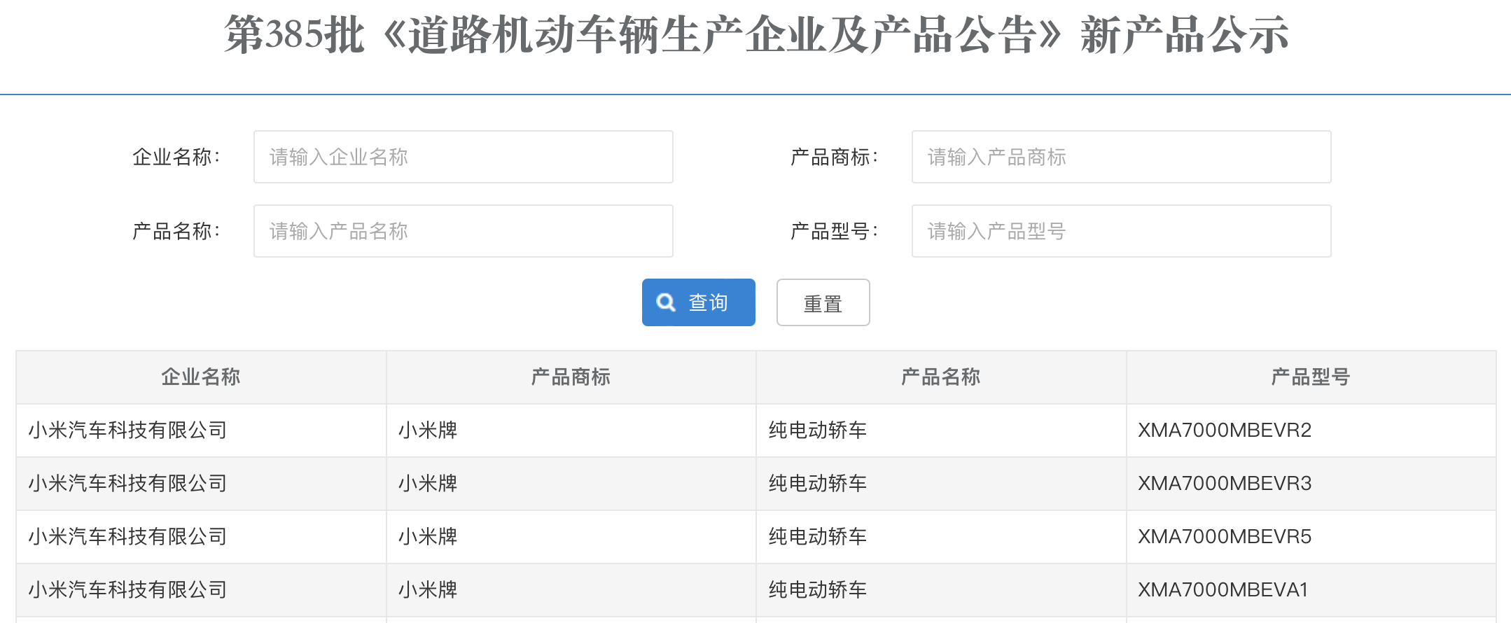 7月12日,在工信部官网披露的第385批《道路机动车辆生产企业及产品公告》新产品公示中,出现四款“小米牌”纯电动轿车,值得注意的是,其企业名称为“小米汽车科技有限公司”。这意味着,小米汽车取得独立造车资质,其生产企业名称也由北汽更换为小米。