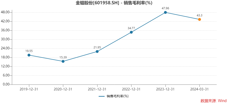 金钼股份整体销售毛利率跃升。2023年销售毛利率47.96%,较2020年增长了32.57个百分点。