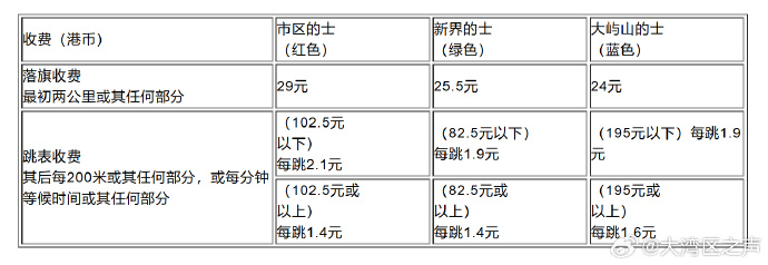 @大湾区之声 消息,香港特区政府运输署今日(13日)宣布,香港巿区、新界及大屿山的士新收费将由明日(14日)起生效。至于三类的士的附加车费,乘客所携带的每件行李(摆放在乘客车厢内的轻便行李除外)的收费会维持为6港元;运载每只动物或鸟类及每程电召预约服务的收费,则维持为5港元。新收费详情如下:
