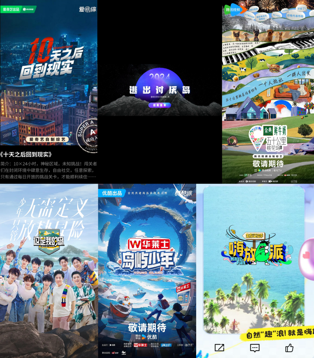近期,犀牛君发觉,爱优腾芒都商量好似的筹备了若干生存综艺新项目——爱奇艺携林更新陈妍希等艺人发博“失联录制”的《十天之后回到现实》最近官宣了全体阵容;芒果首创12位内娱被讨厌艺人生存综艺的《逃出讨厌岛》近日开启了招商;而今年优酷连续开发的两档“岛综”《这是我的岛》《岛屿少年》都颇具话题度;腾讯视频领跑该赛道、本季帮仁科大上分的《五十公里桃花坞4》继续施展内娱捧人神功;浙江卫视邀到任嘉伦刚录制杀青的《嗨放派3》这季副标题叫生存实验季……