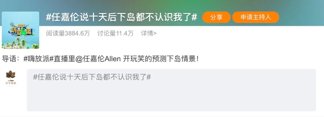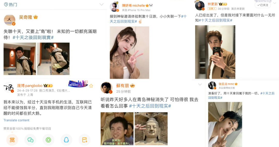 首先犀牛君必须要说,《十天之后回到现实》这个综艺名真的很会起,它不仅能迅速令观众知晓节目模式、且给人很大的遐想空间。而围绕这个节目名,节目组早在录制阶段就携手明星官博策划了叫“2024内娱大规模艺人失联事件”的花式话题营销。过程就是,先由参与录制的明星艺人发博声称“失联十天”引发粉丝好奇与热议,从而炒热了 #林更新准备消失十天#、#这十天侯明昊要去哪# 等批量话题,随后节目组再官宣揭开谜底——即这帮艺人是在青岛与外界隔绝10天录制沉浸闯关综艺连续剧《十天之后回到现实》。