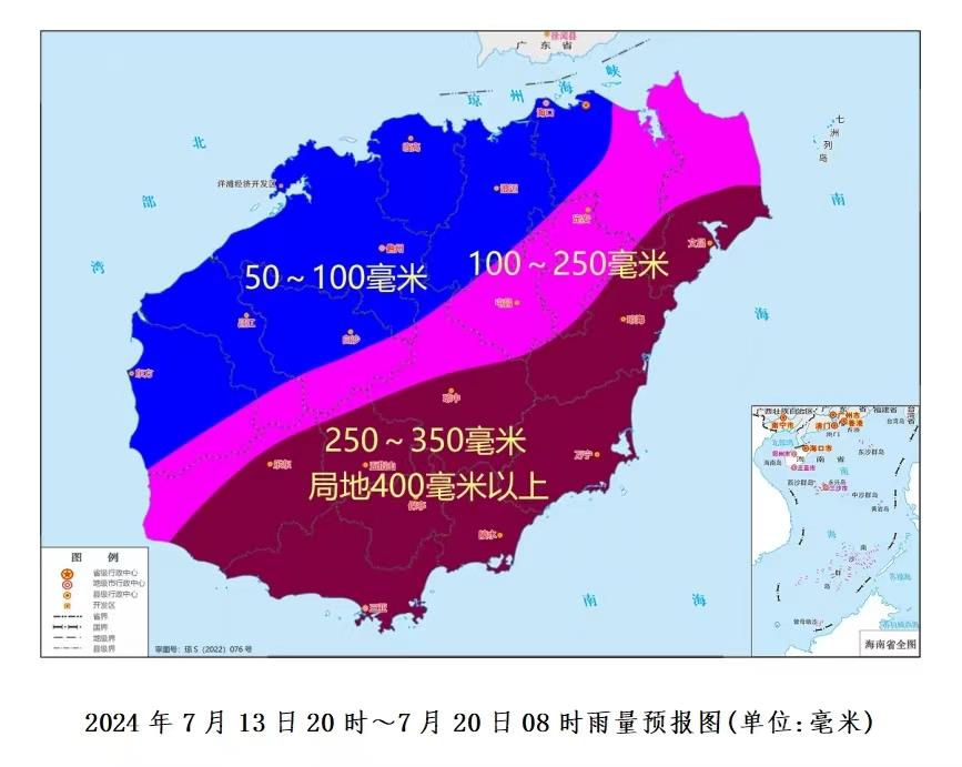 受其影响,海南岛将有持续性较强降水天气过程。海南省气象台预计,13日20时—20日8时各地累积雨量:文昌、琼海、万宁、琼中、陵水、保亭、五指山、乐东和三亚等市县250~350毫米、局地400毫米,定安和屯昌等市县100~250毫米,海口、临高、澄迈、儋州、白沙、昌江和东方等市县50~100毫米。