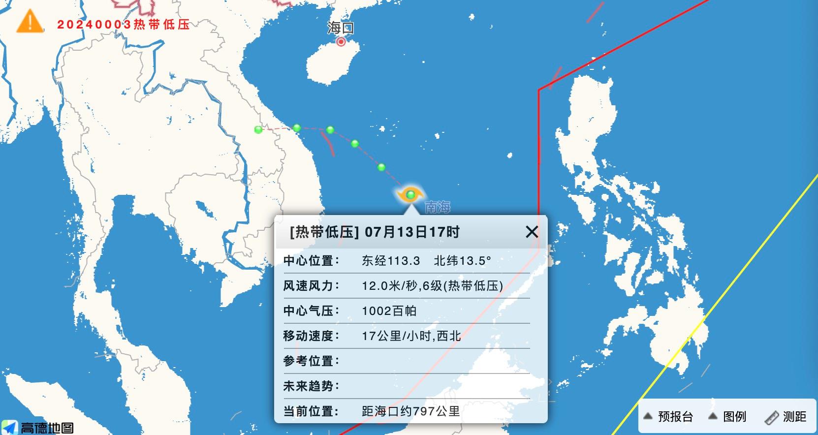 记者从海南省气象局获悉,南海热带低压已于今天(13日)17时生成,其中心位于北纬13.5度、东经113.3度,也就是距离三沙市(西沙永兴岛)南偏东方向约385公里的南海海面上,中心附近最大风力6级(12米/秒),中心气压1002hPa。预计该低压将以每小时15公里左右的速度向西北转偏西方向移动,强度缓慢加强,15日下午到夜间趋向越南东部沿海。