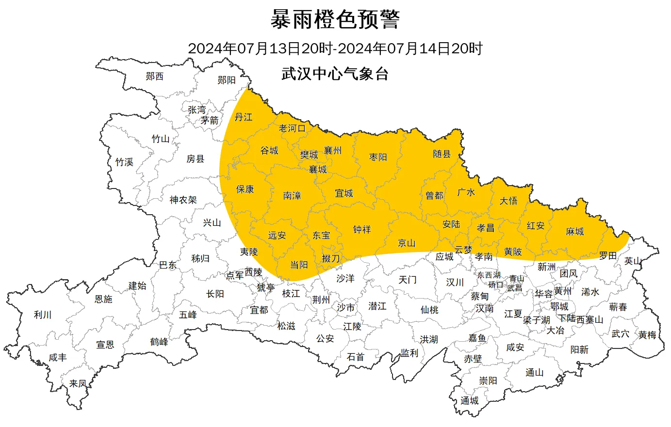 今天下午武汉中心气象台再度发布暴雨橙色预警:预计13日20时至14日20时,十堰东部、宜昌东部、襄阳、随州、荆门、孝感、武汉北部、黄冈北部有大到暴雨,其中襄阳、随州、荆门、孝感北部等地有大暴雨,请注意防范。
