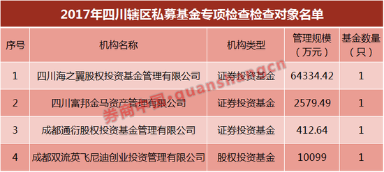 四川证监局表示,按照“两随机、一公开”的要求,于2017年2月15日上午组织开展了检查对象的随机抽签仪式,将对“海之翼基金、富邦金马、成都通衍、双流英飞尼迪”等4家私募机构进行抽查。