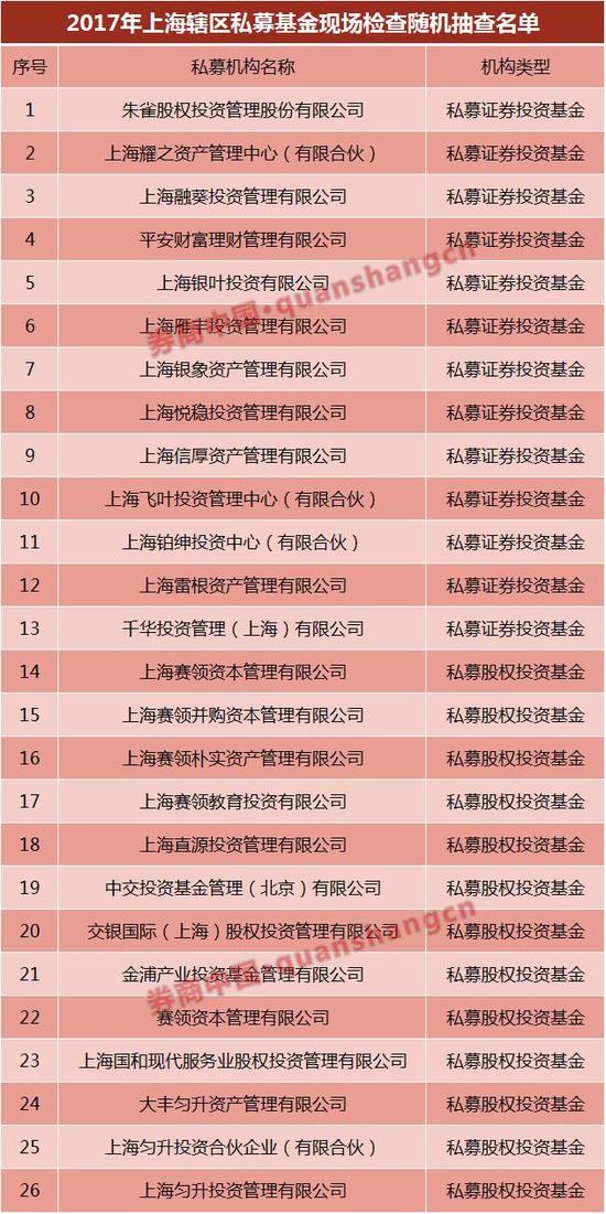 上海证监局表示,上海证监局采用电脑随机抽取程序,随机抽取检查对象及对应的检查人员名单。本次随机抽取共抽取私募证券投资机构13家,其中管理规模100亿元以上的4家,10亿元至100亿元的8家,10亿元以下的1家;共抽取跨区域私募股权投资机构4组共13家,其中管理规模30亿元以上的3组共10家,30亿元以下的1组共3家。
