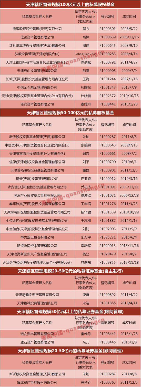 记者查阅中国基金业协会最新统计数据,截至2月28日,天津地区管理规模100亿元以上的私募股权基金共10家,占同等规模私募股权基金总数的12.6%;管理规模50-100亿元的私募股权基金共16家,占比11.7%。