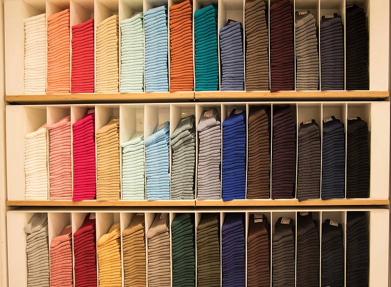 好的商品陈列能刺激顾客的购买欲望,并且能够带动二次消费。摆设说起来其实也很简单,中规中矩型就好。一边是丝袜,另一边就是棉袜。丝袜区按风格来进行陈列,棉袜就按照男袜、女袜、童袜来排版。整体简单,一目了然。