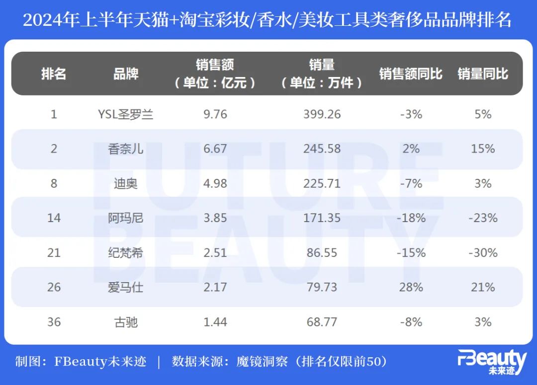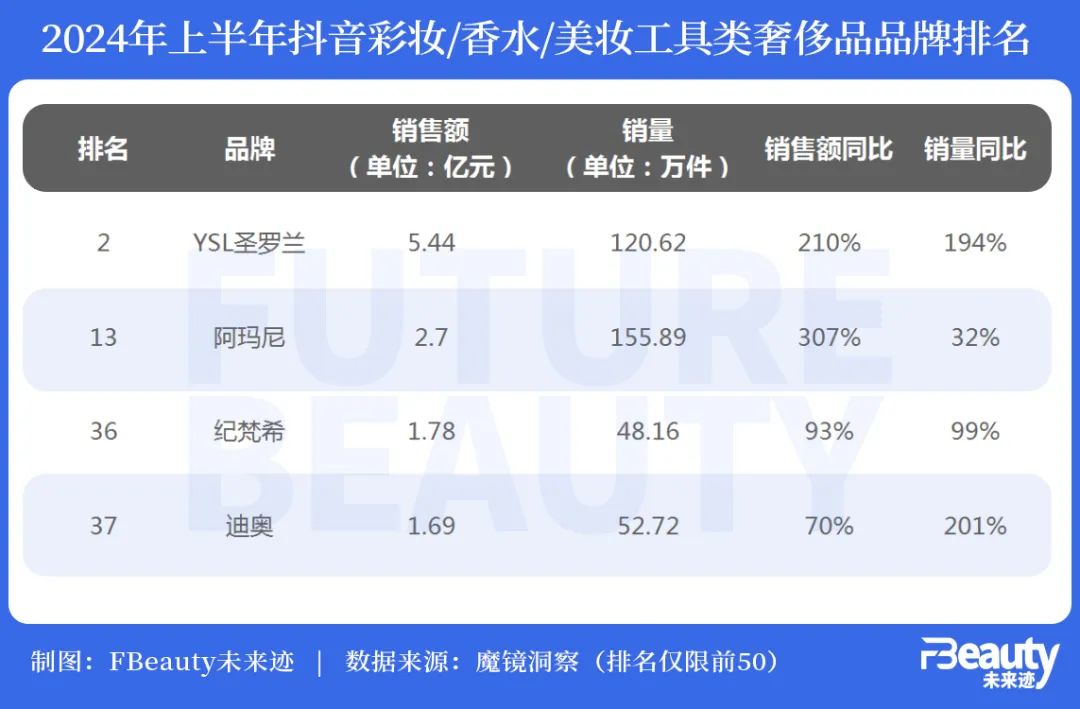 单从中国线上美妆市场来看,《FBeauty未来迹》在魔镜洞察拉取了今年上半年淘系及抖音平台的彩妆/香水/美妆工具类TOP50,并摘取了奢侈品品牌的排名情况。