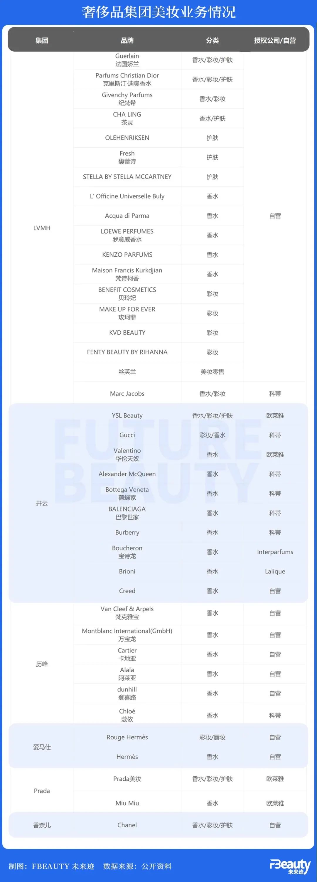 在这7个品牌中,有3个美妆授权在欧莱雅集团手中,即Giorgio Armani阿玛尼、Prada普拉达、YSL圣罗兰,Dior迪奥和Givenchy纪梵希则由LVMH集团自营,爱马仕和香奈儿也分别由其所属集团自营。