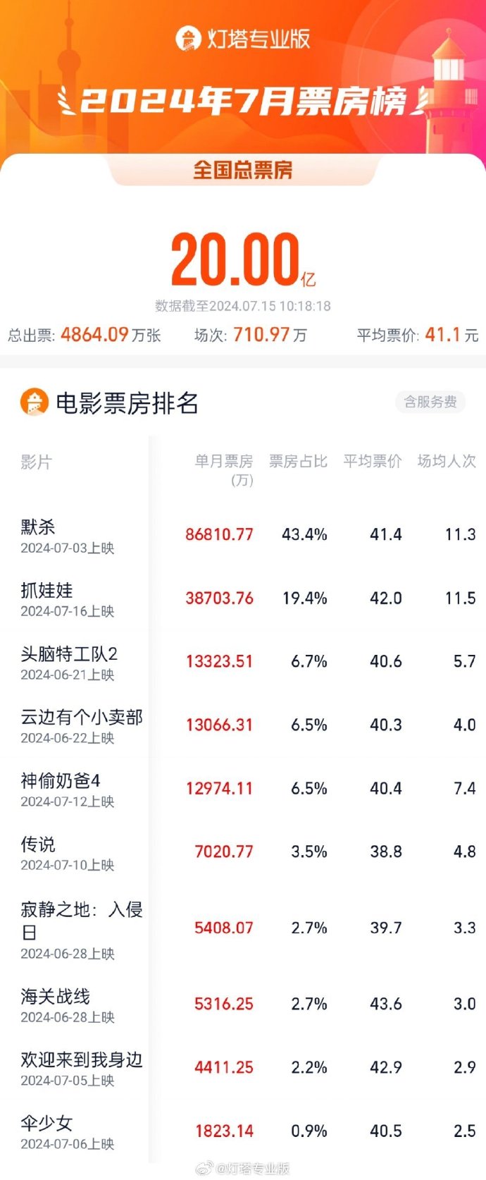 据灯塔专业版实时数据,截至7月15日10时,2024年7月总票房(含预售)突破20亿。