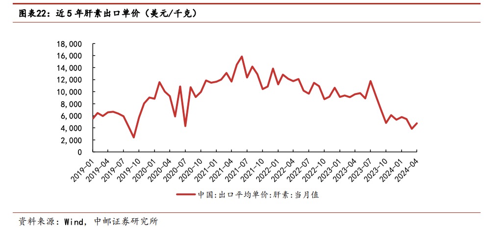肝素类原料药量已回升、价格还需观察。据中邮证劵,今年以来出口价格同比回落,截至4月30日,肝素出口价格为4754.73美元/千克,相较去年同期同比下降50.34%,相较于3月31日价格环比上升24.04%。截至2024年4月,肝素出口单价仍处于历史低点。