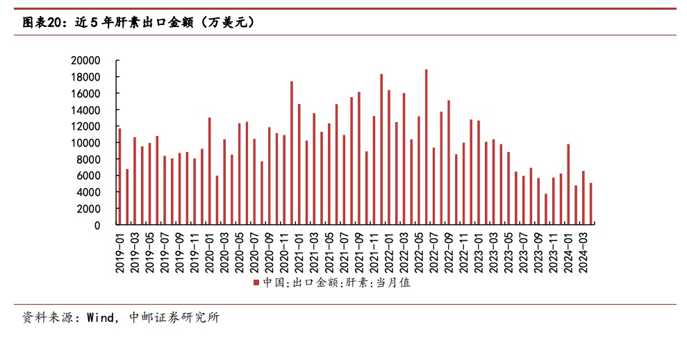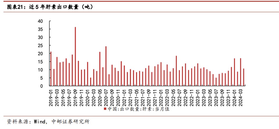 据中邮证劵,从肝素出口金额上看,肝素2024年月1至4月累计出口金额达26235万美元,同比下降38.89%;从出口量上看,1月至4月累计出口量达53.51吨,同比增长15.57%。