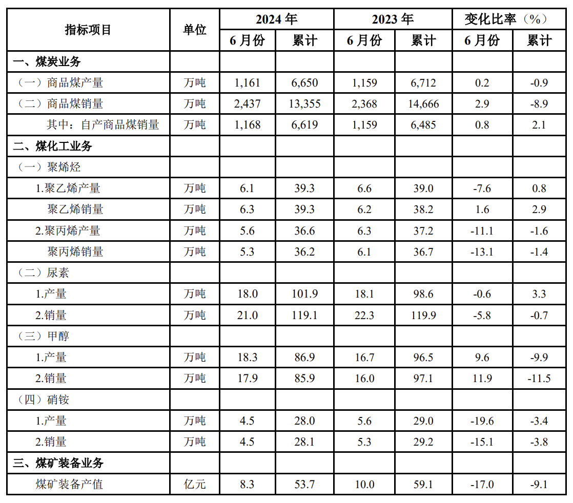 中煤能源7月15日公告,6月商品煤销量2437万吨,同比增长2.9%;本年商品煤累计销量13,355万吨,同比下降8.9%。