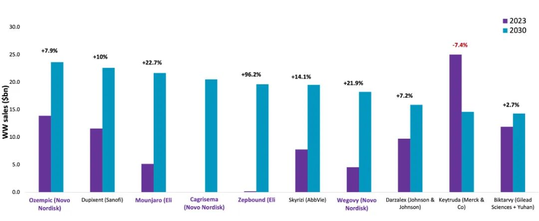 - 默沙东的PD-1单抗Keytruda;尽管此前长期在销售额预测中占据首位,但预计将跌至第九位);Keytruda的关键专利将于2028年到期,或将成为影响其排名的另一因素,因为仿制药可能会抑制其2030年的销售额;