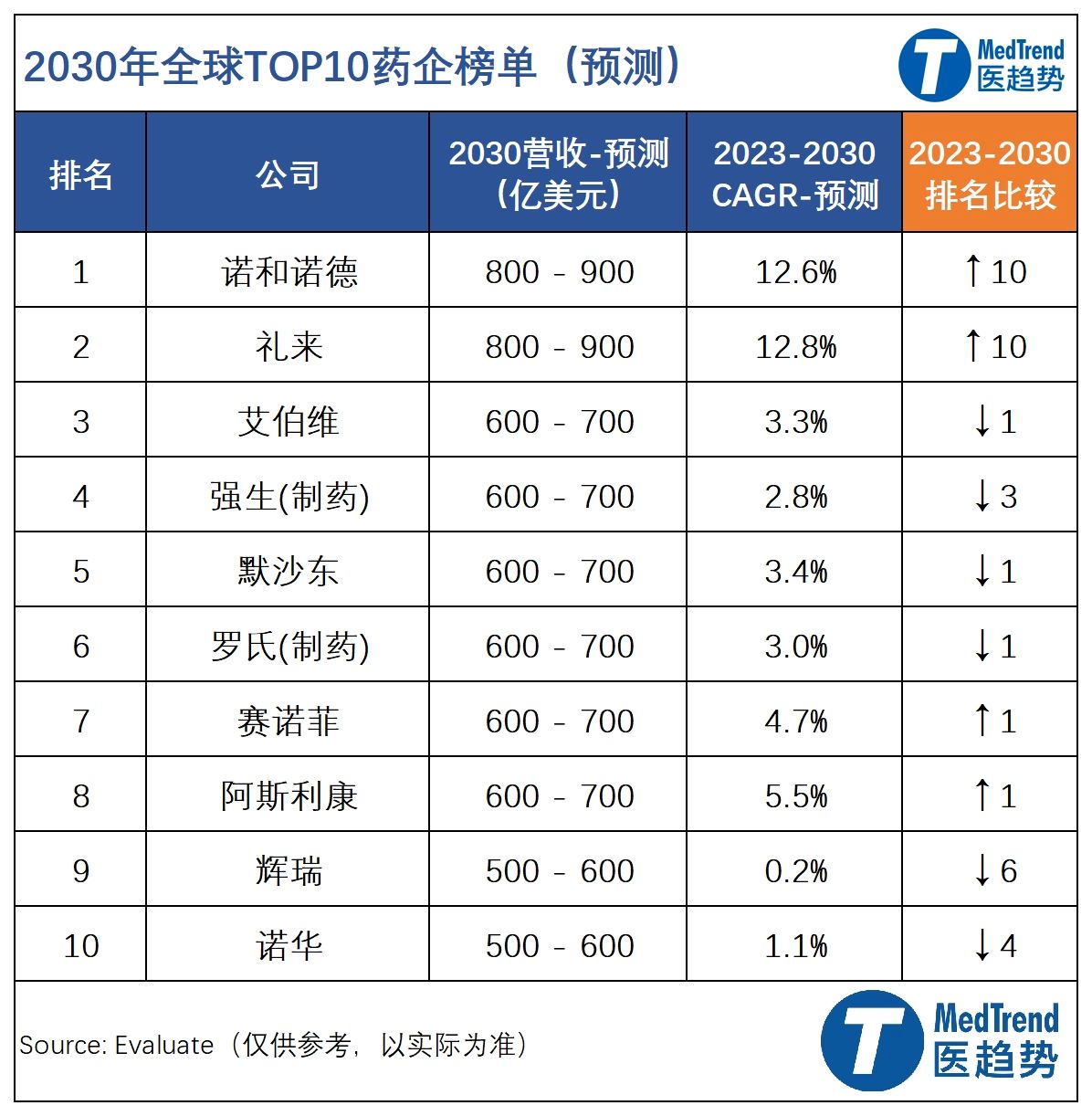 诺和诺德、礼来也可能会互换位置,因为它们都持续面临供应短缺的问题。诺和诺德收购CXO Catalent后,可能在一定程度上获得缓解。除非出现其他黑马,诺和诺德和礼来在2030年之后可能仍将位居前列。