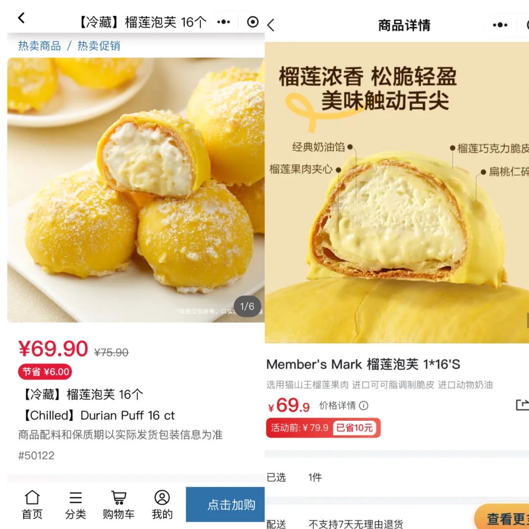 开市客(左)和山姆(右)都推出了“榴莲泡芙”,价格规格相同 图源:小程序截图