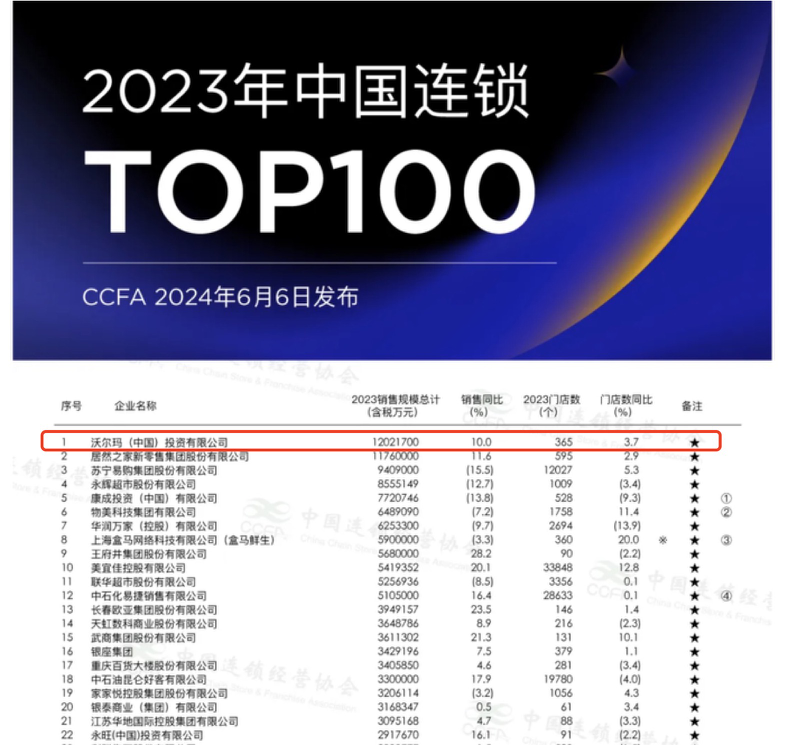 沃尔玛成为最新的中国连锁零售老大 图源:中国连锁经营协会(CCFA)