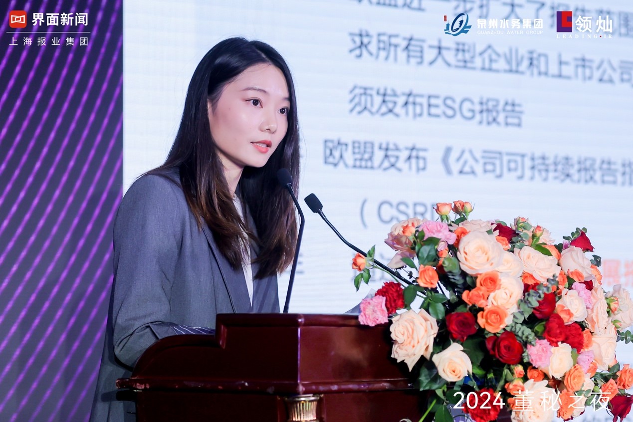 大家热烈的掌声表达出对精彩内容分享的肯定和赞许,紧接着上台分享的是上海领灿ESG业务发展中心暨可持续发展品牌管理中心高级分析师包莹女士,她进行《成就长期可持续价值——2024年界面金勋章ESG奖项解读》的分享。此次分享围绕ESG宏观趋势解读、金勋章ESG奖项解析、年度ESG实践案例展示、年度ESG信息披露官案例展示四个篇章展开。