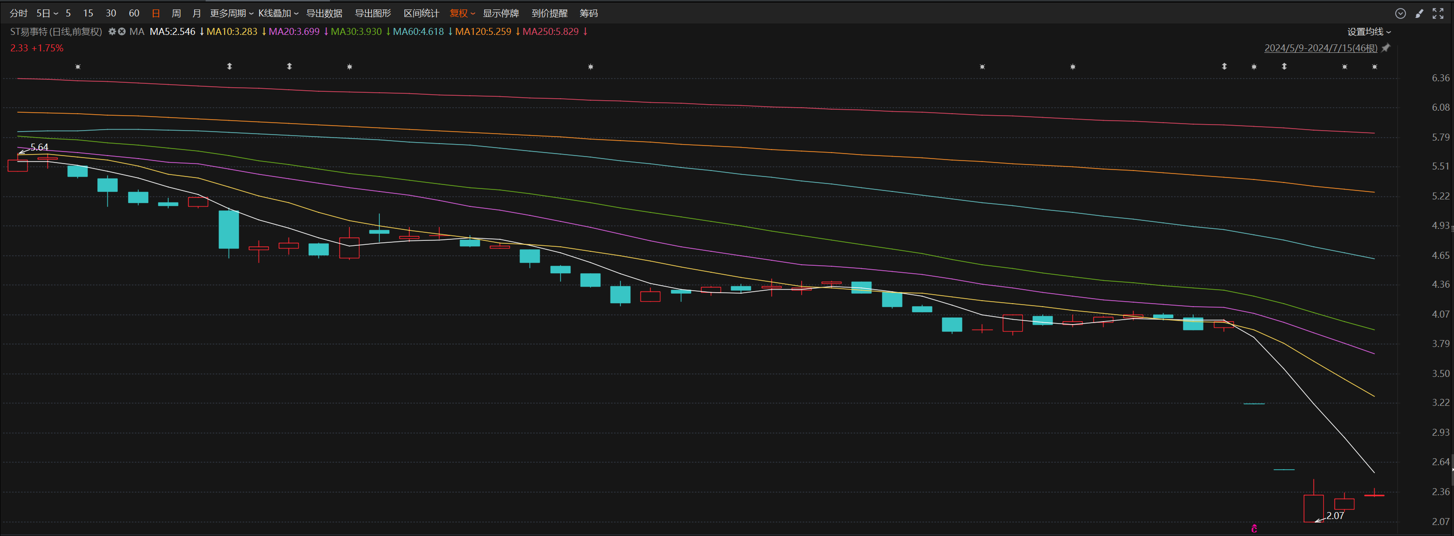 根据《深圳证券交易所创业板股票上市规则(2024 年修订)》相关规定,公司股票交易将被深交所实施其他风险警示。公司股票自7月8日开市起停牌1天,自7月9日开市起复牌;实施其他风险警示后,公司股票交易的日涨跌幅限制不变,仍为20%。公司股票随着被“戴帽”后应声下挫,于7月9日及7月10日一字跌停,并于7月11日触及2.07元/股的低点。截至7月15日收盘,公司股价收涨1.75%,报2.33元/股,总市值54.25亿元。