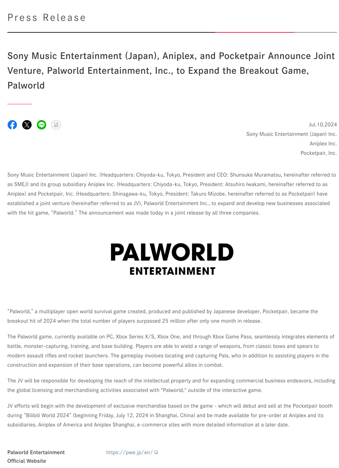 7月10日,索尼音乐娱乐与旗下Aniplex株式会社共同宣布,将与《幻兽帕鲁》开发商Pocket Pair共同成立合资公司“幻兽帕鲁娱乐”(Palworld Entertainment)。