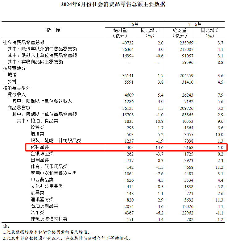 于化妆品行业而言,6月,限额以上化妆品的零售总额为405亿元,同比下滑14.6%;1—6月,限额以上化妆品的零售总额为2168亿元,同比增长1.0%。