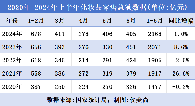 放眼1-6月,化妆品零售增额为2168亿元,创近五年内的新高,但其同比增幅仅为1%,不仅低于2023年同比8.6%的增幅,还远远低于2021年26.6%的增幅。