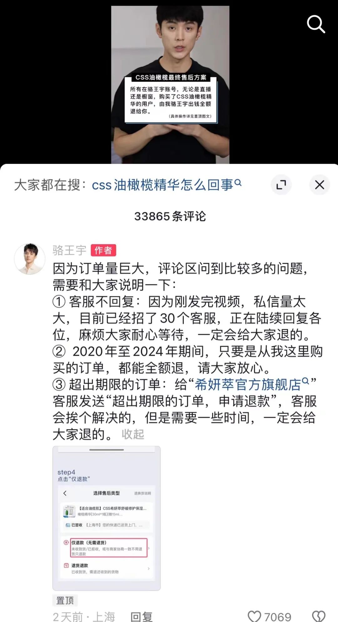 7月12日,骆王宇在其抖音和小红书同步发布了一则“CSS油橄榄退款方案”视频,表示由于品牌不愿意退款,其将为所有在他直播间或橱窗中购买了CSS油橄榄精华的用户全额退款,款项合计约1.5亿元;此外,他本人“准备永远离开(互联网)了”。