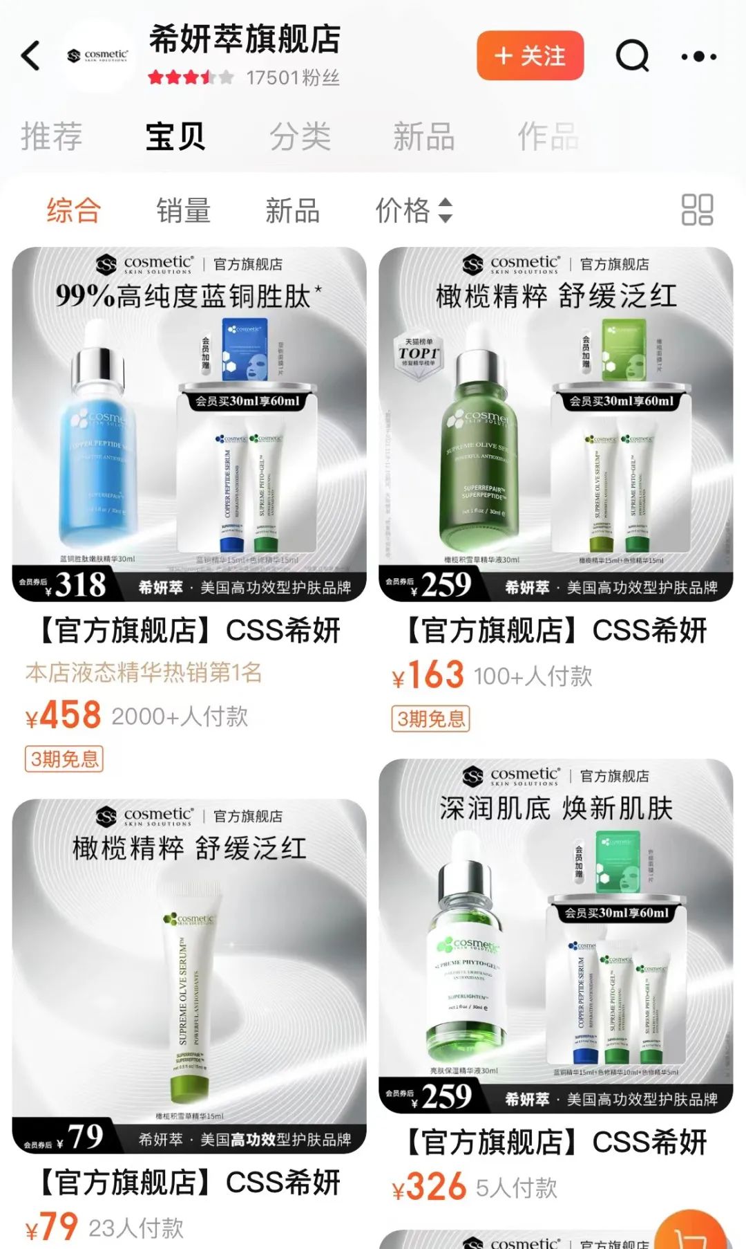 截至发稿,希妍萃天猫旗舰店有1.7万粉丝,上述相关涉事产品仍在正常销售。其中,CSS希妍萃油橄榄积雪草精华30ml售价326元,已售出200+;老爸评测提出“成分造假”的蓝铜胜肽精华已售出2000+。